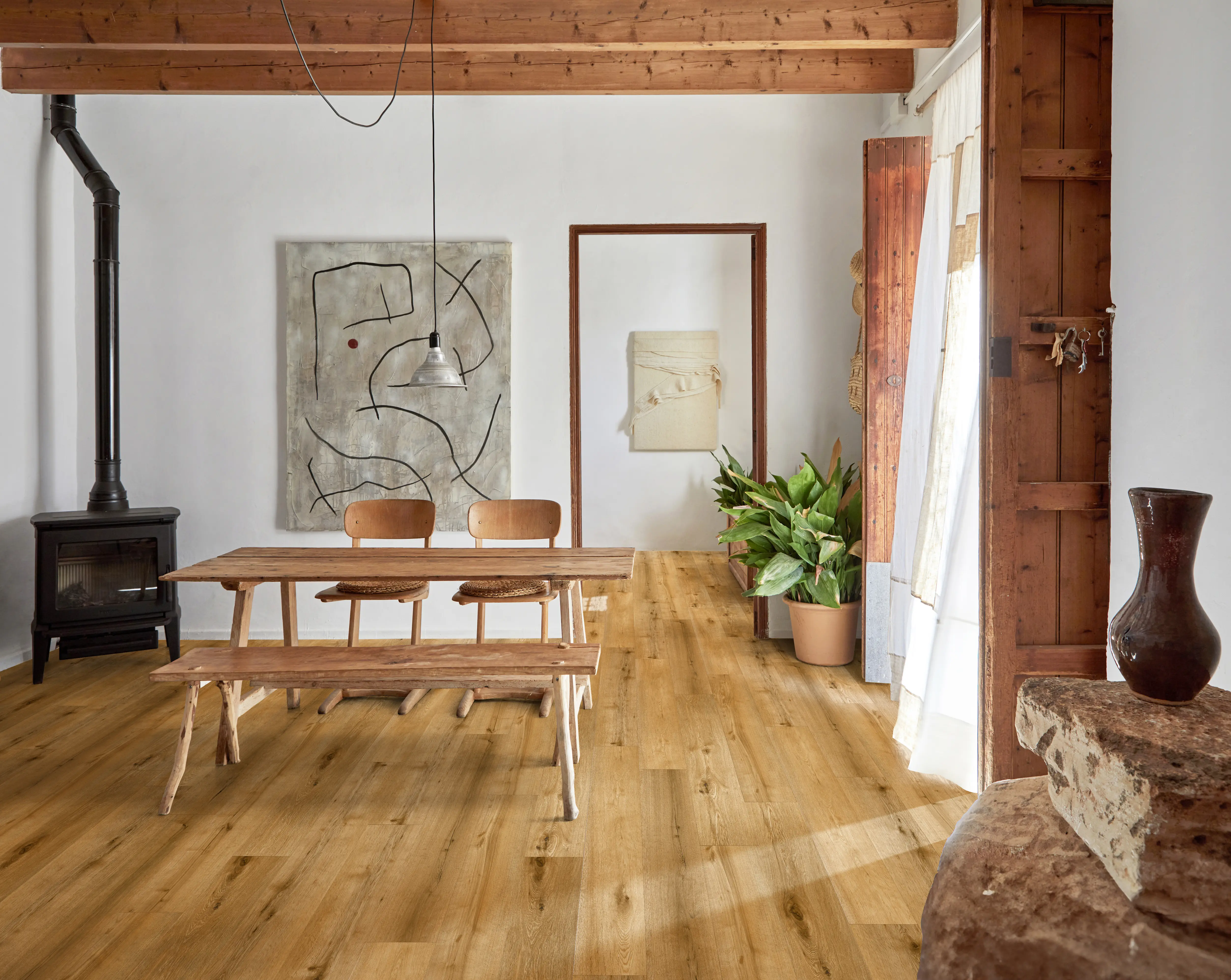 Pět přírodních odstínů dubu kolekce SPC krytin a vinylů Kährs Ranch (Sabiano, Roan, Tobiano, Overo a Marrone) napodobuje strukturu každého uzlu a praskliny dřeva, stejně jako letokruhy a vytváří tak zcela přirozený vzhled dřevěné podlahy. Samotný povrch podlahových krytin byl posunut na vyšší úroveň díky synchrostructure, tedy skutečně reliéfnímu povrchu odpovídajícímu zobrazené textuře dřeva. Komfort pro chůzi i akustiku zajišťuje integrovaná protihluková podložka. Zatímco SPC krytiny kolekce Kährs Ranch jsou pokládány na zámek (1220 x 228 x 5 mm), vinylová obdoba je lepená (1220 x 228 x 2,5 mm). Pro oba typy krytiny je shodná nášlapná vrstva o síle 0,55 mm, což oba materiály posouvá do sféry komerčního využití, tedy kromě bytů je lze pokládat i v restauracích či obchodech. Podlahy jsou voděodolné a vhodné na podlahové vytápění, zároveň umožňují snadnou údržbu.
